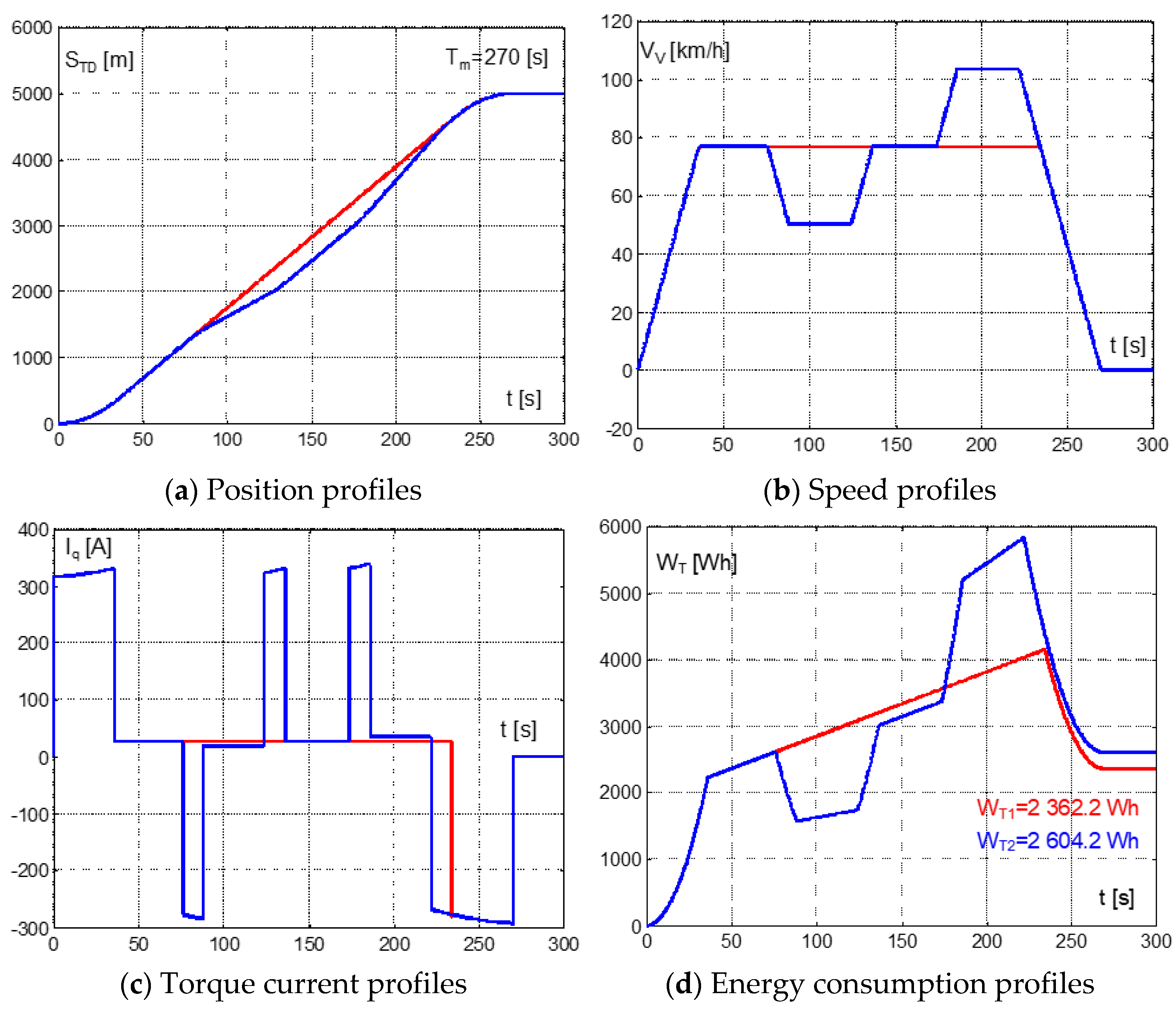 Figure 4a confirms that a required travel distance, STD = 5000 m, was reached at the prescribed maneuver times Tm1 and Tm2 by both runs. Without changes in boundary conditions, the maximums of speed for a journey without limit stood the same, Vmax1 = 86.06 km/h and Vmax2 = 91.84 km/h. There are no differences in motoring and braking currents for a run without speed limits (Iq1 = 371.73 A and Iq2 = 648.64 A), while for a run with speed limit, the peak of motoring current has the same value, Iq2 = 371.73 A, and braking current dropped to Iq2 = 386.85 A.
