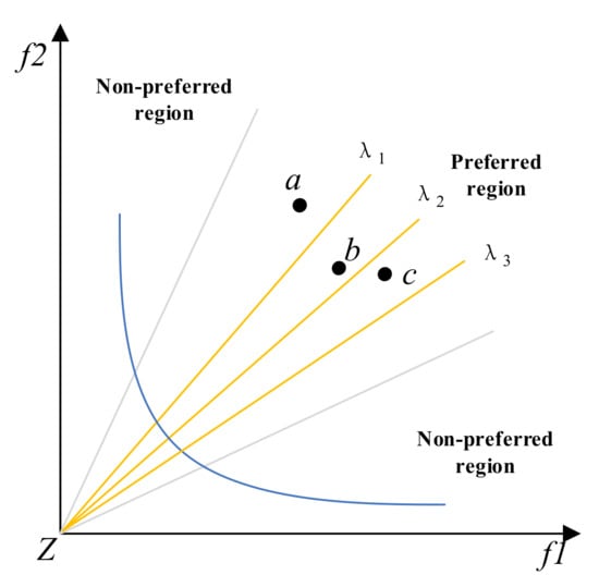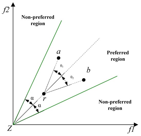 In the traditional angle preference domination relationship, the objective space is divided into a preferred region and a non-preferred region, which is based on calculating the angle between the reference point r and the current objective vector . If the angle θ is less than α, will be considered to be in the preferred region, otherwise, it will be considered to be in the non-preferred region. The angle between the reference point r and the current objective vector can be mathematically described as follows: