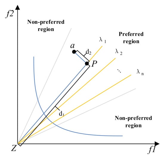In order to enhance the selection pressure of the algorithm to the candidate solutions, an angle preference-based external archive update strategy based on adaptive PBI is presented in this study, in which a set of uniformly distributed reference vectors λ1, λ2, ..., λn are generated in the angle preference region, and the candidate solutions are associated with each reference vector. After calculating the values of the parameter d with Equation (9), a solution with the smallest d will be selected to enter the external archive, where θ is the adaptive penalty factor. Figure 2 illustrates how d is calculated between the candidate solution a and the reference vector , where is projection length and is vertical distance. The further the candidate dissociates from the reference vector, the greater the penalty. d and θ are defined as: