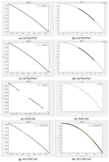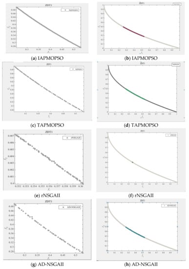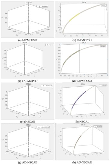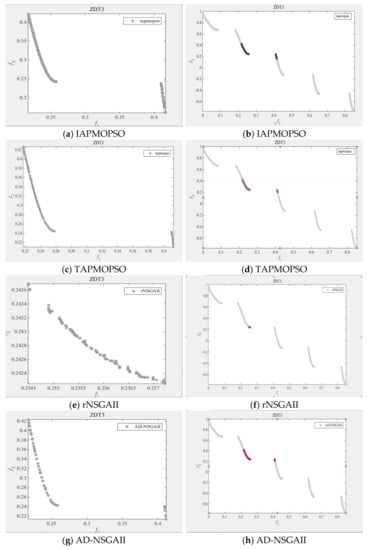 In Figure 4, Figure 5, Figure 6, Figure 7, Figure 8 and Figure 9, the subfigures on the left side are the preferred solutions set obtained by the corresponding algorithm, and the subfigures on the right side are the position of the solution set at the true PF. From these Figures, the improved algorithm could better converge to the true PF and obtain more evenly distributed solutions on most test functions.