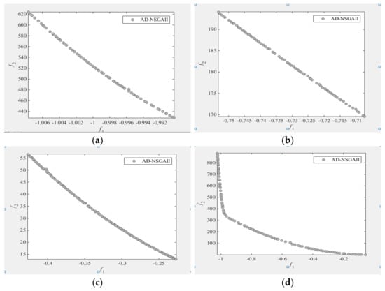 It can be observed from Table 2 and Table 3 that the performance of the proposed algorithm on ZTD1, ZTD2, DTLZ2, and DTLZ7 is significantly outperformed by the comparison algorithms in terms of both GD and HV values, the performance of the proposed algorithm on ZTD3 is almost the same as that of the classic algorithm rNSGAII, the performance of the proposed algorithm on DTLZ6 is slightly worse than that of the comparison algorithm. From the overall simulation results, the proposed algorithm has the best results on most benchmark functions, and it is superior to the TAPMOPSO, rNSGAII, and AD-NSGAII in both convergence and diversity of the resulting approximation sets. From the above empirical results, it can be concluded that the algorithm proposed in this paper could obtain a set of accurate and well-distributed solutions on most MOPs.