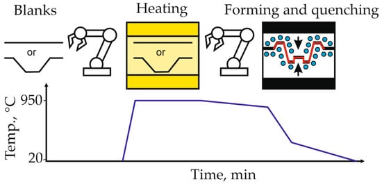 Hot stamping is a technology that allows for the integration of the conventional stamping and heat treatment processes [5,6]. The material, which is typically a 22MnB5 steel blank or a pre-formed element, is austenitized at ~ 920–950 °C as in the typical heat treatment process [7]. The steel sheet is then transferred to the press, where it is formed and cooled at a rate that allows the martensitic transformation to take place (Figure 1). High-temperature pressing allows for a more complex shape to be obtained by lower forces, as the austenitic phase exhibits much better plasticity and ductility, but the product strength is reduced [8]. However, for continuous operation, the mold must have water channels that allow it to maintain a low temperature so that the hardening process can proceed correctly [9]. The final product of hot stamping exhibits a shape–strength relationship, which is currently impossible or very difficult and expensive to obtain using a different method [10].