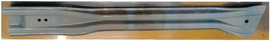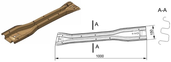 The current study addresses the hot stamping of a front door beam, whose CAD (computer-aided design) model is shown in Figure 2. A front door beam strengthens the door and protects the driver and passengers from the effects of a side impact. It is a double U-shaped beam with a length of 1000 mm and a width of 150 mm. The material used for the investigations was a 1 mm thick sheet of Usibor® 1500P [11] steel produced by ArcelorMittal, which is a type of 22MnB5 steel. The typical chemical composition of 22MnB5 steel is given in Table 1 [12]. The aim of this research was to produce a part with the geometry shown in Figure 2 and a minimum hardness of 400 HV1.