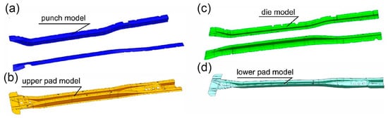 CAD models of the tools: (a) punch, (b) upper pad, (c) die and (d) lower pad.