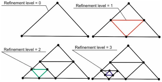 The blank was meshed with three-node EPS-11 [13] finite elements with an initial size of 10 mm. These are elastic plastic shell elements with 11 points of integration along the thickness. Each node of the element has five degrees of freedom: three translations towards the two tangent vectors and the normal vector, and two rotations with the tangent vectors as the axis of rotation. They are recommended by the manufacturer of the Autoform R10 software for modeling the phenomena that occur during hot stamping. During the stamping analysis, mesh quality adaptation was selected with a control parameter of 3, which allows for each triangular element to be divided into 4 parts. The principle of dividing triangular finite elements into parts according to the value of the refinement level parameter is shown in Figure 5.