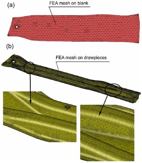 Size and shape of the FEM mesh that was applied to the blank (a) and on the drawpiece (b).