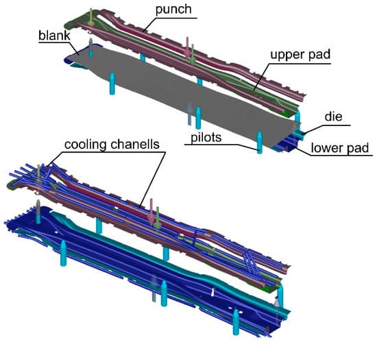 As shown in Figure 1, the hot stamping process integrates several operations [11]. It is usually fully automated with manipulators or robot arms that are used to transfer elements between the blank pile, furnace, press and finished parts storage [12]. The proper design of the entire process is required to obtain a final product of the desired shape, microstructure and properties regardless of the size and a level of geometric complexity. The process starts with a design of the elements. Next, the die model is prepared, which properly shapes the blank without weakening its structure by excessive thinning. Another very important step is the design of a cooling system. The water channels must be distributed in the die in a way that ensures an adequate cooling rate that is specific for a given shaped product. The hot stamping design process is continuously refined using the latest simulation methods [3,13,14,15]. The comprehensive process design of hot stamping for a specific product is very important for the modern automotive industry and for the advancement of steel applications [2,16,17,18]. Therefore, this paper presents a case study of the design process, simulation and experimental evaluation of the hot forming of an automotive door beam.