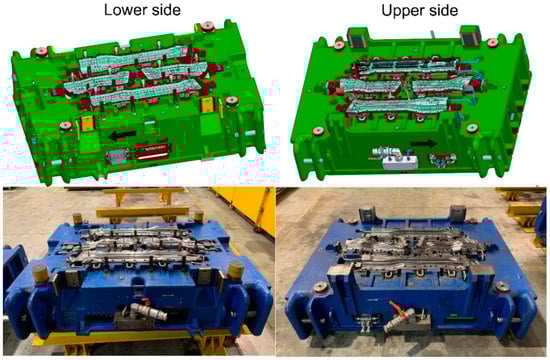 The simulation results were used in the design and production of the full-size hot-forming tool. Figure 8 compares the CAD model of the upper and lower parts of the tool to photographs of the upper and lower parts of the actual tool that is used to produce a set of door beams. The set of symmetrical door beams includes four beams: two for the front door and two for the rear door.