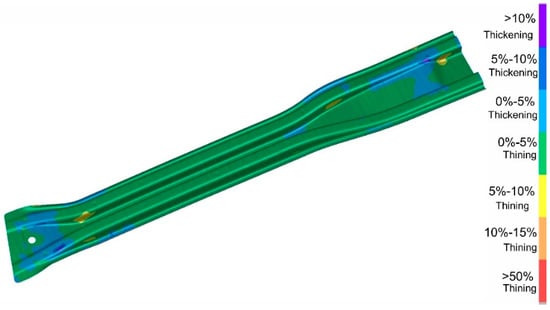 There should be no areas on the drawpieces where the thinning is greater than 10%. The results of the thickness change simulations, presented in Figure 11, identified no regions where the thinning exceeded the limit value.