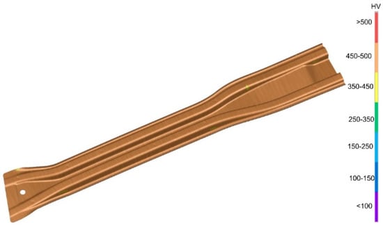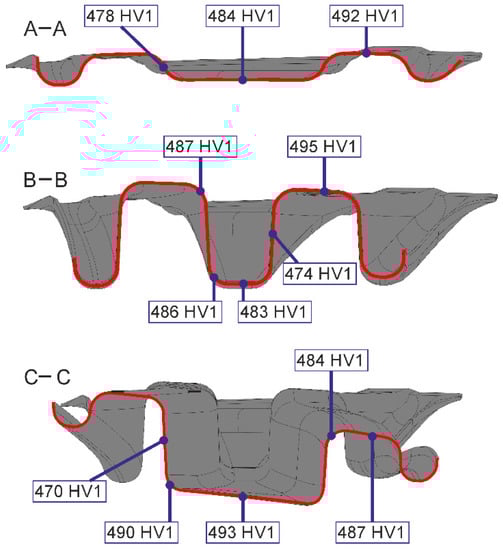 Figure 19 shows how the hardness of the part changes depending on the cross-section and its specific area. The average hardness of the part was 486 ± 8 HV1, which significantly exceeds the assumed minimum value. The average hardness for the curved and flat surfaces, which are perpendicular to the operation direction of the tool, showed a similar average hardness of 489 HV. However, the hardness value was slightly lower (472 HV1) for the surfaces parallel to the operation direction of the tool. The simulation results (Figure 13) show that these areas were quenched last. The cooling rate was lower in these areas, which may result in a slightly lower hardness [23].