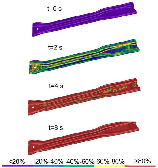 We also analyzed the simulated hardness of the drawpiece (Figure 12) after the forming and quenching process and its structural changes (Figure 13) during forming and quenching progress. The hardness of the drawpiece after processing should be greater than 400 HV. The simulation results showed that this condition was properly met. Figure 13 shows the results of the quenching in the form of distribution lines of the percentage of martensite in the hot-stamped element during quenching.