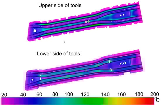 Figure 14 shows the simulated temperatures of the working surfaces of the upper and lower parts of the tool after 12 cycles. The highest temperature on the working surface of the tool was 115 °C, which did not exceed the maximum value of the assumed working temperature of the tool (200 °C). These results indicated that the properly designed cooling system allows for continuous work of the die in the hot stamping process.