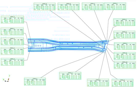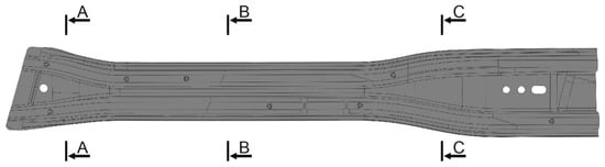 Figure 15 shows the forces acting on the individual elements of the tool that are necessary to form the drawpiece. The simulation results indicated that the proposed parameters of the hot stamping process, including the proposed division of the tool into a punch, a die and stamps, meet the technical and technological requirements. There was no risk of zones with wrinkles and cracks. The drawpiece also achieved the required parameters related to quenching (hardness and microstructure). After 12 operating cycles, the tool reached a constant and safe working temperature. This designed tool was used to produce the beam test series. Figure 16 shows the manufactured beam, which was the subject of the FEM analysis described in this paper. The beam was tested for shape-and-dimensional accuracy. The shape and dimension measurements were obtained using a coordinate measuring machine. Figure 17 shows an example of a measurement card. The assumed accuracy was not exceeded in any of the tested points, and it is in line with the simulation.