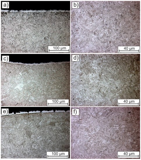 The micrographs presented in Figure 20 show that all sample areas exhibited fine and homogeneous martensitic microstructure [24]. The only difference was visible in the surface layer (Figure 20a,c,e). The blank was covered by Al–Si anti-corrosive coating [25]. The coating was below 15 μm in thickness and was continuous for the flat (Figure 20a) and concave surfaces (Figure 18C). However, for convex surfaces (Figure 20e), the coating was discontinuous and cracked due to the strong local deformation.