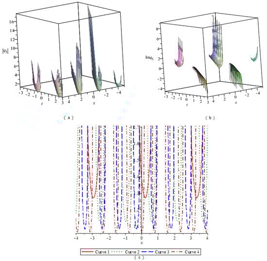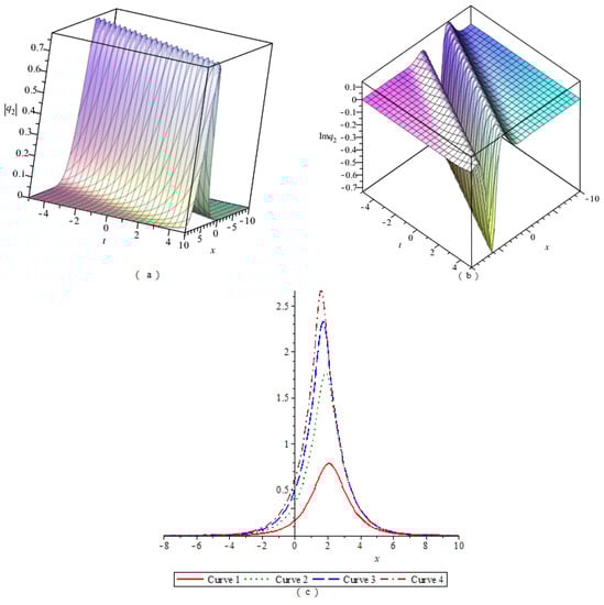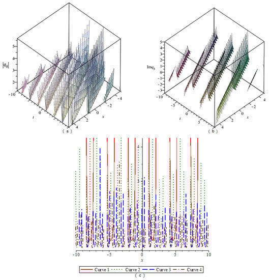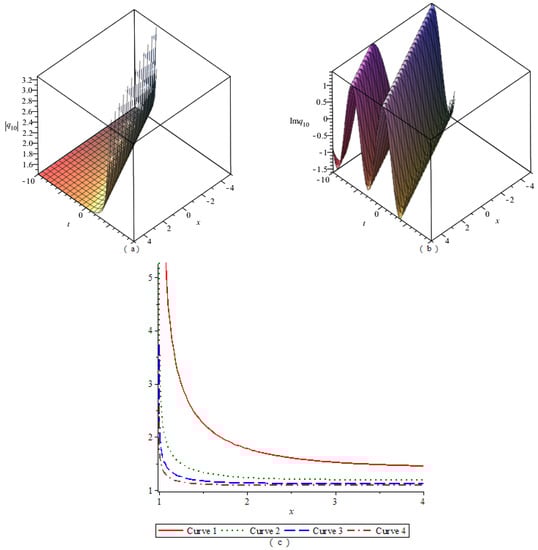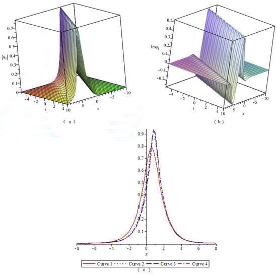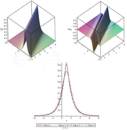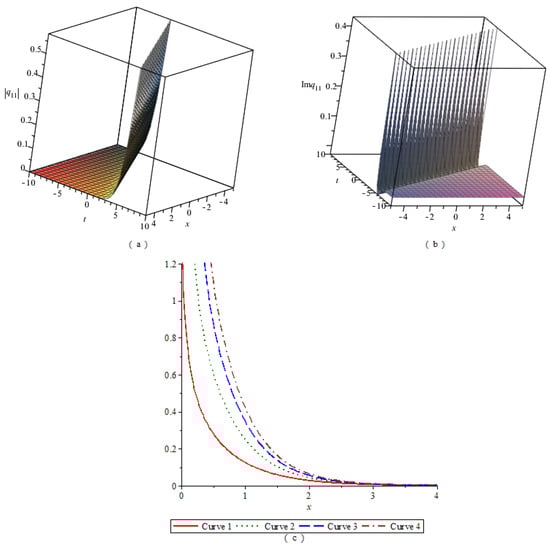 By numerical simulation, the corresponding graphs of the optical soliton solution (23)–(33) of Equation (2) are given under the given fixed parameter values, which include the 3D graphics of the module, the 3D graphics of the imaginary part, and the 2D graphics of the module changing with n. According to these graphs, the wave structures of the optical wave solutions are analyzed. The 2D graphics of the module changing with n tell us that the amplitude of the wave is symmetrical or asymmetrical. In Figure 1, Figure 2, Figure 3, Figure 4, Figure 5, Figure 6, Figure 7, Figure 8, Figure 9, Figure 10 and Figure 11, (a) represents the 3D graphics of the module () with ; (b) represents the 3D graphics of the imaginary part () with ; (c) represents the 2D graphics of the module () with and . For (c), corresponds to Modulus Curve 1; corresponds to Modulus Curve 2; corresponds to Modulus Curve 3; corresponds to Modulus Curve 4.