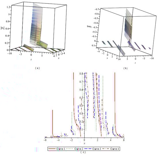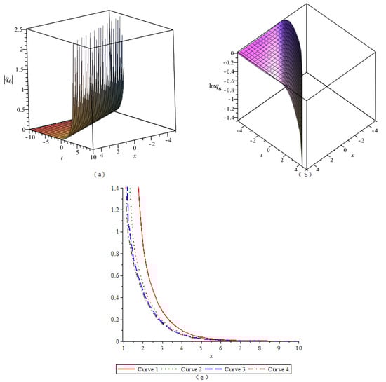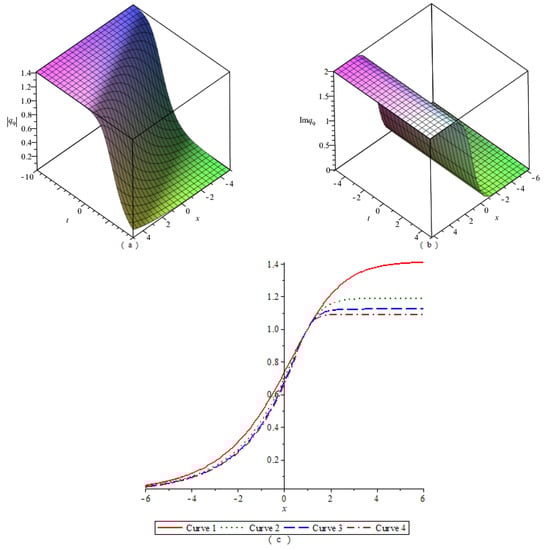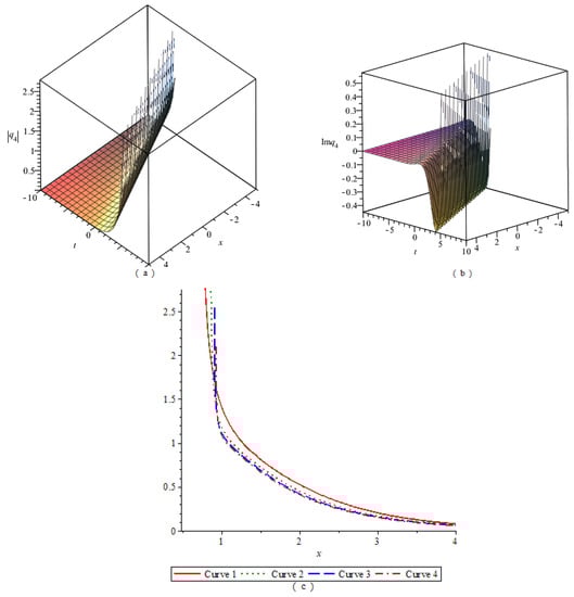 From Figure 1, Figure 2 and Figure 3, we observe that the module (), which is a wave packet, is a solitary wave; the imaginary part is similar to a W-shaped solitary wave; the amplitude of the wave packet increases with the increase of . Figure 4, Figure 6 and Figure 10 represent the wave structures of the singular soliton solution of Equation (2). Figure 5 and Figure 7 represent the wave structures of the periodic soliton solution of Equation (2). Figure 8 represents the wave structures of the singular-periodic soliton solution of Equation (2). Figure 9 represents the wave structures of the kink soliton solution of Equation (2). Figure 11 represents the wave structures of the exponential-type soliton solution of Equation (2).