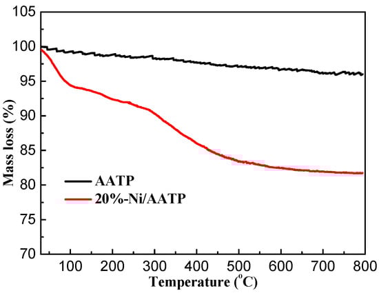 The thermal analysis of AATP and the uncalcined 20%-Ni/AATP catalyst are shown in Figure 1. The TG curve of AATP shows a slight weight loss of 4% from room temperature to 800 °C, while with the uncalcined 20%-Ni/AATP sample a continuous mass loss of 17.4% from 30 to 600 °C occurs. Typically, weight loss below 120 °C (~6%) can be attributed to the release of adsorbed water in Ni/AATP. The slight weight loss from 120 to 290 °C (~3%) corresponds to the remaining crystallization water of the precursor [31]. In the temperature range of 290~550 °C, the weight loss (~8%) is attributed to the decomposition of a large amount of Ni(OH)2 [32], a small amount of NiCO3 [33,34,35] and some NiCO3·2Ni(OH)2·4H2O to NiO, and a release of H2O and CO2. When the temperature is higher than 550 °C, almost no weight loss is detected, indicating that the Ni/AATP has been transformed into a stable state. Therefore, all the Ni/AATP samples are calcined at 600 °C before the test.