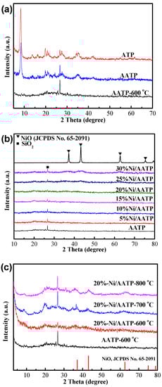 The XRD patterns of the different supports (natural ATP, AATP and 600 °C-calcined AATP) are shown in Figure 2a. In the natural ATP sample a typical peak at 2θ = 8.3° is observed, which is the basal space of the ATP framework [36]. The diffraction peaks at the 2θ of 13.7°, 16.3°, 19.7° and 20.7° represent the Si-O-Si crystalline layers in the clay [36]. In addition, an intense peak situated at 2θ = 26.7° can be attributed to crystalline SiO2 that exist in the clay [30]. The XRD pattern of AATP shows similar diffraction peaks to the ATP, indicating the ATP after the acid digestion and alkali reprecipitation treatment still maintains the ATP structure. After calcinating at 600 °C, the peak at 2θ = 8.3° of AATP-600 °C is disappeared, owing to amorphization and destruction of the crystal structure of attapulgite at high temperature [37]. Figure 2b provides the XRD patterns of x%-Ni/AATP samples calcined at 600 °C. No obvious NiO characteristic peaks can be observed when the loading amount of Ni is below 25%, which may be due to the formation of highly dispersed NiO particles on the surface of AATP. When the Ni content increases to 25%, three weak and broad diffraction peaks at 2θ = 37.1°, 43.1° and 62.6° can be observed, which can be assigned to NiO crystal phase (JCPDS 65-2901). Further increasing the content of Ni, stronger and narrower peaks can be seen, probably owing to the aggregation of NiO nanoparticles and the increasing of NiO particle size in the Ni/AATP system. To investigate the thermal stability of the as-prepared Ni/AATP catalysts, the 20%-Ni/AATP sample is calcined at different temperatures (600, 700 and 800 °C), and their XRD patterns are shown in Figure 2c. Noticeably, a very weak increase of NiO characteristic peaks can be observed, indicating a faint growth of nanoparticle size and the crystallinity of NiO during the thermal treatment.