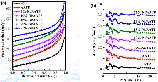 (a) The N2 adsorption-desorption isotherms of AATP and Ni/AATP catalysts and (b) the corresponding pore size distribution curves on the basis of NLDFT method.