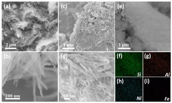 The SEM images of AATP support are shown in Figure 4a,b. The ATP and AATP are composed of highly dispersed fiber-sharped attapulgite with 20–50 nm in diameter and 0.2–2 μm in length. After loading with Ni species, the surface symmetric morphology of 20%-Ni/AATP catalyst possess many nanoparticles (Figure 4c,d). It is notable that the Ni/ATTP remains high dispersion, leading to high surface area and large pore volume (Table 1). To investigate the Ni distribution on AATP, EDX elemental mappings of Si, Al, Fe and Ni are shown in Figure 4e–i. The homogeneous brightness and distribution indicate the high dispersion of Ni species on Ni/AATP system.