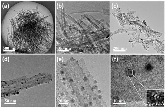 TEM images of AATP (a,b) and the 20%-Ni/AATP (c–f).
