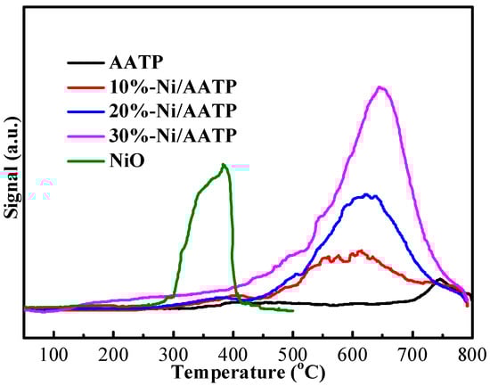 Figure 6 shows the H2-TPR curves of the Ni/AATP catalysts and AATP support. NiO nanoparticle is also presented for comparison. It is shown that the AATP has a weak H2 consumption peak at a high temperature range of 700–800 °C, which may be caused by the reduction of impurity FeO to Fe [41]. The result suggests that a small amount of Fe species exist in the AATP support (consistent with the element mapping image in Figure 4i). H2-TPR curve of NiO particles shows an H2 consumption peak at temperature range of 300–450 °C, corresponding to the reduction of NiO to Ni [22]. Differently, the reduction temperatures of all the Ni/AATP catalysts shift to a higher temperature of 500–750 °C, probably due to the presence of a strong interaction between NiO and support [10,42]. It is known that Si-OH can react with metal species, forming Si-O-M bonds [10]. Herein, the AATP generates much of the Si-OH groups during the activating of ATP. Thus, Si-O-Ni species can be formed in the catalyst, increasing the reduction temperature of NiO species to Ni0.