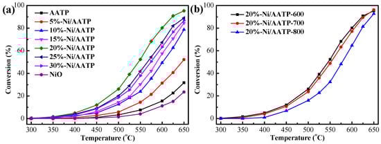 The conversions of the Ni/AATP catalysts with different Ni content and calcination temperature.