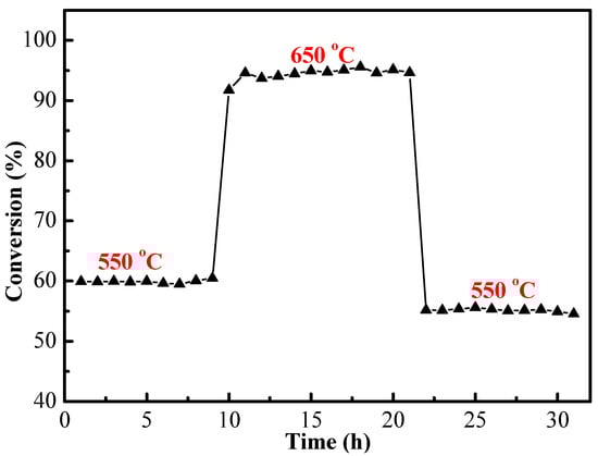The stability testing of 20%-Ni/AATP catalysts calcined at 600 °C.