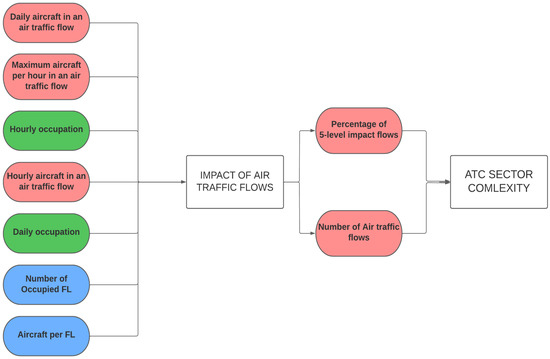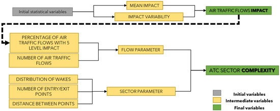 This methodology is therefore the proposed methodology for defining complexity in the airspace. This methodology defines both the complexity of ATC sectors and the impact of air traffic flows daily. This methodology is based on statistical variables obtained from individual operations in the sector over time. For a better interpretation of the complexity definition methodology, these variables have been divided into four different areas [30]: