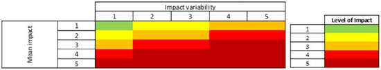 This model table is based on a risk matrix [34,35]. In these matrices, the risk tier of the impact and the probability of occurrence are assessed. In these matrices, the two variables are discretised from 1 to 5 and a discretised risk from 1 to 5 will also be obtained. In this model table, the axes will be the average impact and the variability of the impact. These two variables will also be discretised from 1 to 5, resulting in 5 impact tiers. Tier 1 is green, and tier 5 is dark red. The distribution of impact tiers has been done employing expert opinion with staff from Enaire, CRIDA and Universidad Politécnica de Madrid.