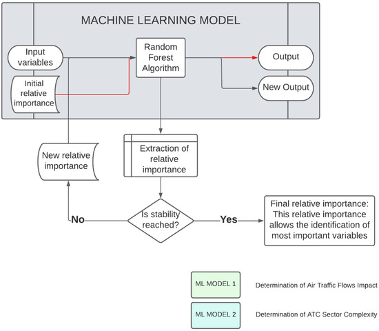 Figure 3 presents the process of obtaining the relative weights which tell which variables are most important in determining impact and complexity. The process marked in red indicates the first iteration of the loop, using the weighted sum with the weights indicated in [30], based on expert opinion. In black is marked the update loop of the relative importance, this loop is run until it reaches the final relative importance with which stability is reached. As the process is common to the two machine learning models defined, the input and output variables of the model are not specified in the process of Figure 3. It has been specified in Figure 3 that there are two models, the first to determine the impact of air traffic flows, and the second to determine the complexity of the ATC sectors.