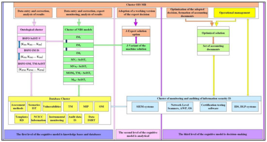 We considered a formalized description of the cognitive model (CM) of the functioning of IS for various purposes in the conditions of CIs (Figure 1). The developed CM has three functional levels.