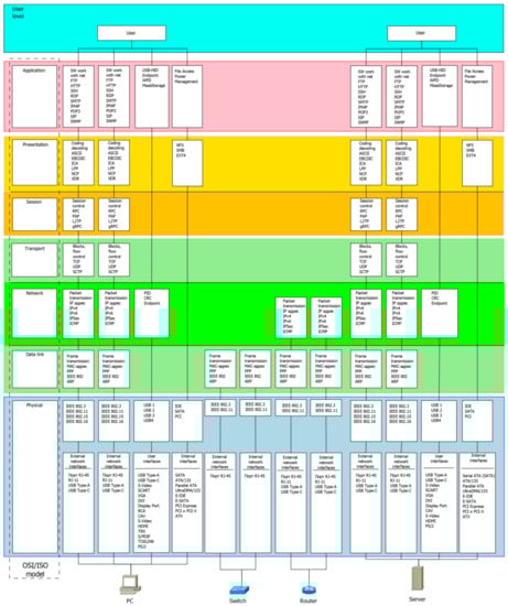 The process of data transmission and storage is displayed by an open network model—the Basic Reference Model Open Systems Interconnection model (the OSI/ISO model)—which has seven levels [8]. With the help of that model, it is easy to determine the structural and functional connections of elements of local information, computing networks, and IS in general. Everything that happens when sending and receiving data, as well as the physical and logical devices involved in those processes, interfaces; Protocols are described in detail by a seven-level OSI/ISO model.