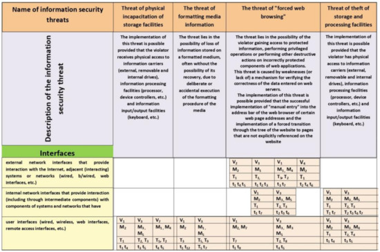 In this matrix, the names and descriptions of the ISTs are placed horizontally, and the vulnerabilities are placed vertically. If a threat can be implemented through one or several vulnerabilities, then the name and content of the method of its implementation, Si, as well as the scenario (tactics and techniques) of application, are indicated in the cells at their intersection.