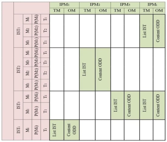 The process of forming ontological connections of contrasting protective measures for the ISTs is presented in Figure 4 in the form of a matrix, in which the IPMs are represented horizontally and the ISTs are represented vertically. In the cells at the intersection of the ISTs and the OMs and TMs opposed to them, lists of the information security tools implementing them and regime measures are indicated.