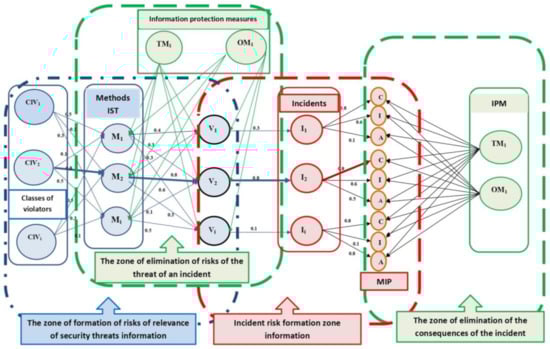 Here, the a priori probability that the violator of the ICi will be able to implement the ISTs by the Mi method will depend on the a posteriori probability of the presence of a vulnerability that is not closed for this method of Vi.