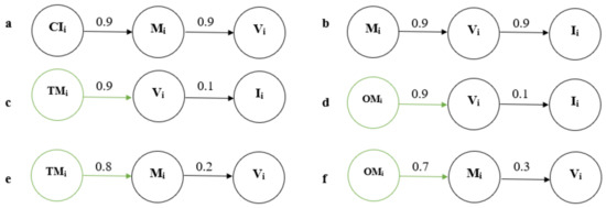For divergent events, the a priori probability of the existence of vulnerability Vi and the possibility of implementing ISTs by the Mi method will depend on the a posteriori probabilities of the implementation of OMi and/or TMi.