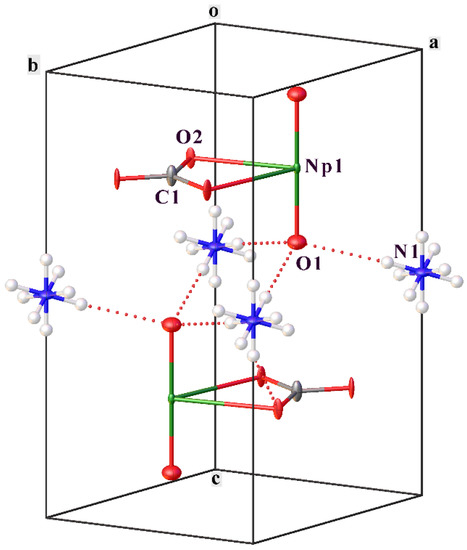 The unit cell of (NH4)[NpO2CO3] is shown in Figure 1. All atoms occupy special positions: Np1—position 2d, symmetry (−6m2); O1—position 4f, symmetry (3m.); C1—position 2c, symmetry (−6m2); O2—position 6h, symmetry (mm2); N1—position 2a, symmetry (−3m.); H1A—position 4e, symmetry (3m.); and H1B—position 12k, symmetry (.m.). The H atoms are disordered by symmetry over two positions.