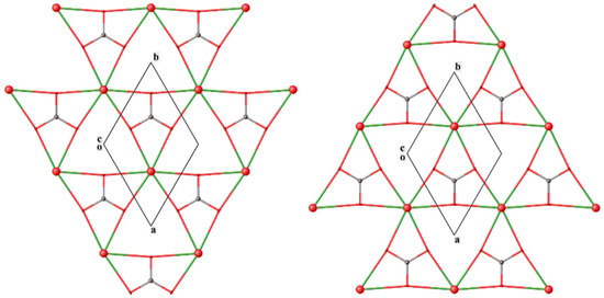 Anionic layers in the (NH4)[NpO2CO3] structure. (Left): z = ¾, (Right): z = ¼.