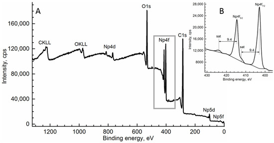 X-ray photoelectron spectra. (A)—Survey XPS spectrum; and (B)—Np4f spectrum of the (NH4)[NpO2CO3].