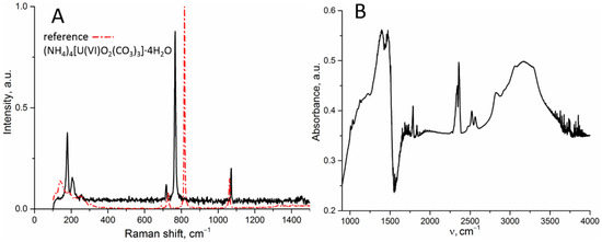 Spectroscopic data for the (NH4)[NpO2CO3]. (A)—Raman spectra of the (NH4)[NpO2CO3] (black line) and reference (NH4)4[UO2(CO3)3]·4H2O (red line) and (B)—IR absorption spectrum.