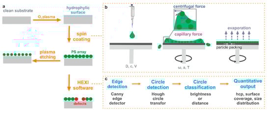 (a) Overview of the main steps used during template preparation. (b) Schematic drawing of the main stages of the monolayer deposition by spin coating. (c) Key stages of the image analysis algorithm (HEXI software) used to verify the quality of the template.