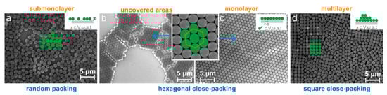 Template preparation is based on a self-assembled array of spheres, commonly referred to as colloidal crystals (CC), which serve as a lithographic mask or template for various subsequent deposition, etching, or imprinting processes [,]. The spheres can be easily synthesised (e.g., precipitation, emulsifier-free polymerization, Stöber method, etc.) and are commercially available as a dry powder or water dispersion. The manufacturer provides spheres with various properties: material (density, refractive index), diameter (mean size and size distribution), particle concentration, surface chemistry (functionalized, charged particles), hybrid particles (spheres with porous morphology, hollow spheres, spheres with shells of various material, coloured particles). Polystyrene (PS), polymethyl methacrylate (PMMA), and silicon dioxide (SiO2) spheres with a diameter of 0.2 to 2 µm (size distribution 5–7%) are the particles that are the most commonly used particles for the template preparation [,,,].