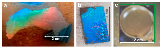 The first indication of the decent quality of a self-assembled monolayer is angle-dependent iridescent colour (for a better illustration, see Figure 3a—floating monolayer in a Petri dish and on Si substrate Figure 3b) generated from the Bragg diffraction of the visible light on the CC. After the spin coating process, the edges of the square (rotationally asymmetric) substrates were patchy because the corners create turbulence, resulting in poor coat quality (Figure 3c). The ‘coffee staining’ effect (the particles tend to form a ring-like pattern, which is macroscopic in size and visible to the naked eye), originating from the difference in the evaporation speeds across the droplet, was also observable as an undesirable pattern in some monolayers [,,].