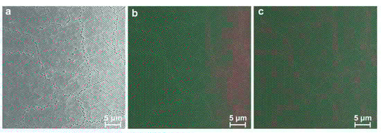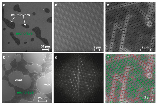 The quality of the self-assembled monolayer is often assessed by fast Fourier transformations (FT) []. The Fourier transform image with sharp peaks is often used to demonstrate the six-fold symmetry of the self-assembled monolayer (Figure 4d), but it cannot provide a single intuitive result value that would express the ordering quality of the hcp mask []. The defect-free area of the hcp domain is in the range of 10–200 µm2 (greatly limited for spheres with polydisperse or multimodal size distribution) []. However, these values are based only on a rough estimate [,].