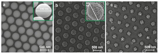 Plasmonic nanoantenna arrays can be created by combining the self-assembly of PS nanospheres, reactive ion etching, and metal sputter coating []. Gold “nanocorals” (i.e., non-close-packed anisotropic structures) were created by gold sputtering on an array composed of structures shown in Figure 8b. Long-necked ball-and-stick structures (Figure 6c,d) were used as a template for gold sputtering to obtain a hexagonal array of gold bow-tie nanoantennas with controllable gap sizes. After the removal of the spheres, a planar triangle nanoantenna array was obtained that served as SERS-active substrates for ρ-aminothiophenol [].