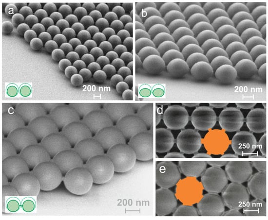Net-like structures were also observed after thermal annealing (Figure 6e). During heating, the PS spheres fuse with each other and the point contacts between the particles are converted to area contacts due to melting of the soft PS polymer []. It should be noted that thermal treatment (in the case of PS close to the glass transition temperature of 100 °C; 5–10 s) also mechanically improves adhesion between the spheres and the substrate material [,]. However, the size of thermally formed neck-like connections often reveals larger sizes and limited controllability in comparison with PS treated in the LAP system.