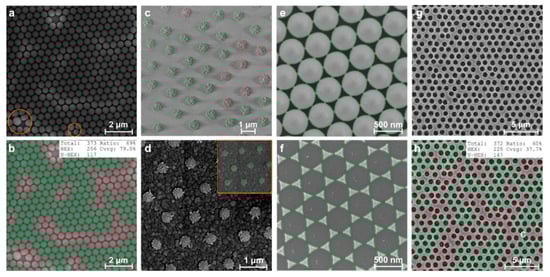 For accurate sample evaluation (verification of order and symmetry), we developed the open source image analysis software HEXI (implemented in Python), which detects circles and distinguishes between hcp ordering and defect configurations (e.g., point defects, dislocations) []. In the first stage, the algorithm identifies circular structures in SEM images using the Canny edge detector and the Hough circle transform (Figure 1c). Next, the detected circles are classified as hexagonally ordered spheres or defects (see Figure 4f with differently coloured circles drawn in the image) [].