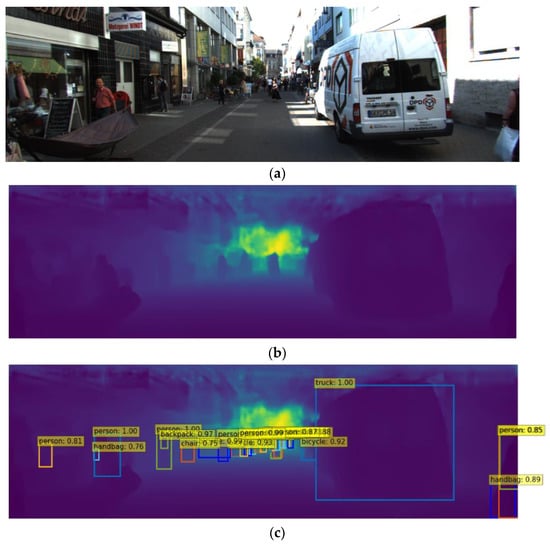 Depth map estimation using the depth estimator in this study: (a) the original image, (b) the estimated depth map, and (c) the overlaid depth map with the identified bounding boxes using the object detector in this study.