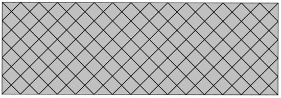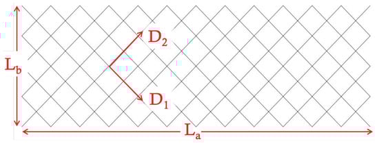 The microstructure shown in Figure 2 can be modeled by means of a discrete model where the deformations of the fibers are written in terms of different kinds of springs. This discrete model can be then homogenized for obtaining the continuum strain energy discussed in the following. To this aim, consider a 2D continuum whose reference shape is given by a rectangular domain , where and are shown in Figure 2. Very often, it is assumed that . This aspect ratio is generally considered everywhere in the literature on pantographic metamaterials. Its meaning is due to the fact that, when studying this kind of metamaterial, one is mainly interested in bending of fibers (this deformation, in fact, is related to second gradient of the placement field in the continuum model), and for observing a pure bending deformation, it is necessary to have at least a 1:3 ratio. In fact, considering the sample as divided in three squares, only the central one has sides that are not clamped. In the clamped extremities, important contributions due to the elongation of fibers must also be considered. Therefore, the minimal aspect ratio for observing “unclamped” bending of fibers is 1:3. If only planar motions are considered, then the current shape of the rectangle is mathematically described by a regular placement function . By means of asymptotic homogenization of the microstructure and assuming that is at least twice differentiable, the macroscopic strain energy obtained by homogenizing the discrete system [1] is